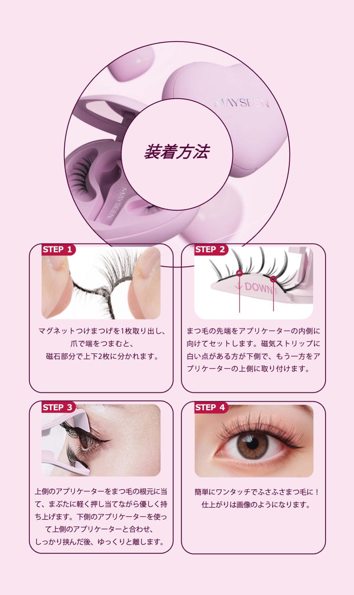 装着クリップ:アジア人女性の目の形状に合わせた視覚デザインで、上下まつ毛の区別が容易簡単装着:3ステップの簡単な取り付け方法で、わずか3秒でボリュームのあるまつ毛に